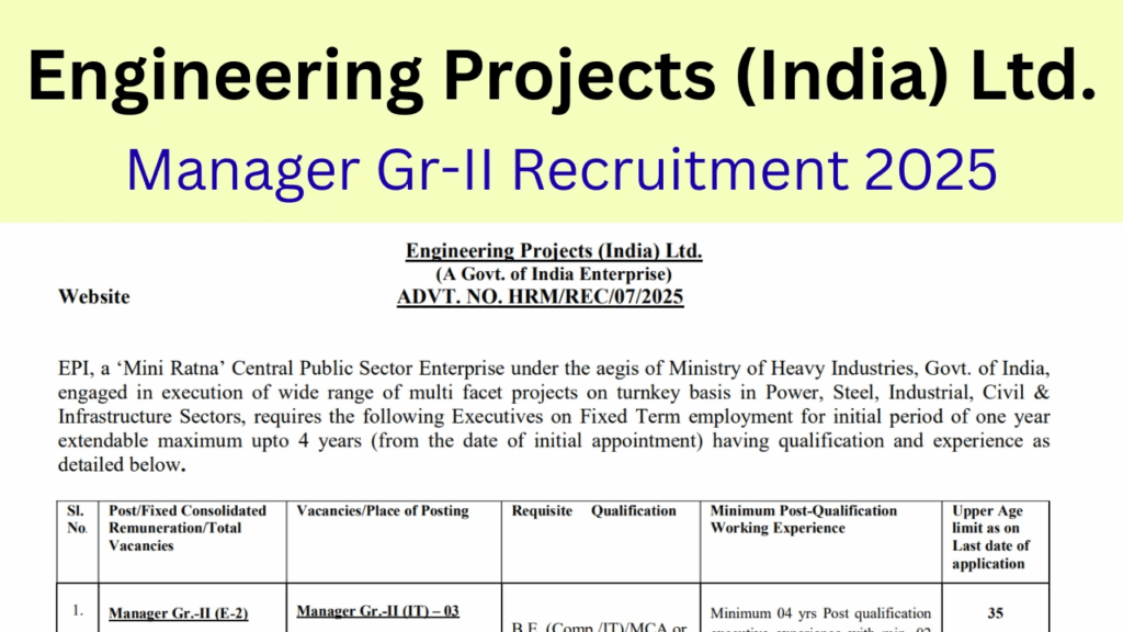 Engineering Projects (India) Ltd. (EPI), a ‘Mini Ratna’ Central Public Sector Enterprise under the Ministry of Heavy Industries, Government of India, has announced multiple job vacancies for qualified, experienced, and dynamic professionals. EPI, which specializes in executing diverse, multi-facet projects on a turnkey basis across Power, Steel, Industrial, Civil, and Infrastructure Sectors, is inviting online applications for various Executive (Manager) posts on a Fixed Term employment basis for the year 2025.