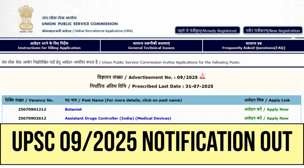 The Union Public Service Commission (UPSC) has announced Recruitment Advertisement No. 09/2025, presenting a significant opportunity for individuals seeking government jobs across various departments in India. Online applications are now open, inviting eligible candidates to apply for a range of Group A and Group B positions, including Botanist, Drug Controller, Engineer, and Officer roles.